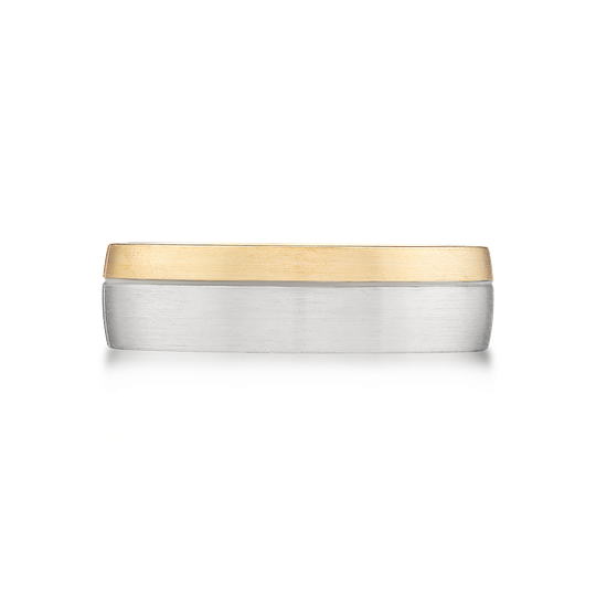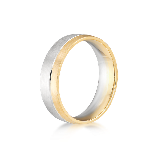 Aliança em ouro de 19,2 quilates com perfil liso e interior amendoado, para maior conforto. Aliança acetinada em ouro branco e ouro amarelo divididos por friso subtil. Uma escolha marcante para uma aliança de casamento.