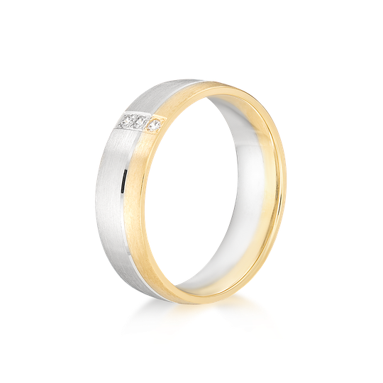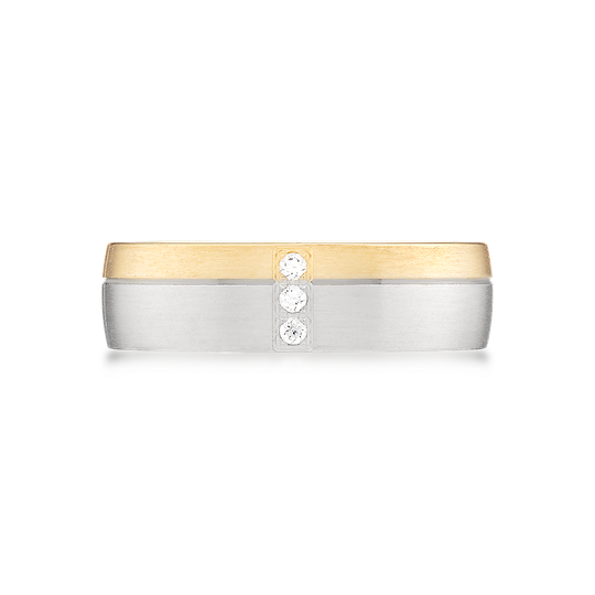 Aliança em ouro de 19,2 quilates com perfil liso e interior amendoado, para maior conforto. Aliança acetinada em ouro branco e ouro amarelo divididos por friso subtil e três zircónias cravadas em linha perpendicular. Uma escolha marcante para uma aliança de casamento.