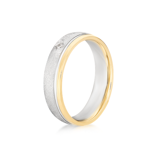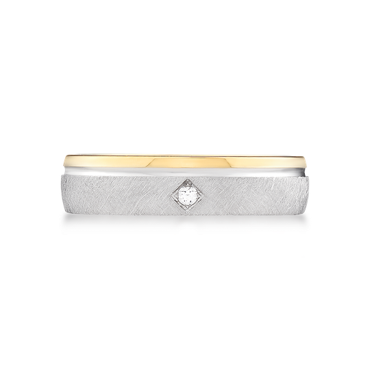 Aliança em ouro de 19,2 quilates com perfil liso e interior amendoado, para maior conforto. Aliança com acabamento riscado em ouro branco e ouro amarelo dividida por friso subtil e zircónia cravada com efeito de losango. Um jogo de formas e texturas numa aliança de casamento surpreendente.