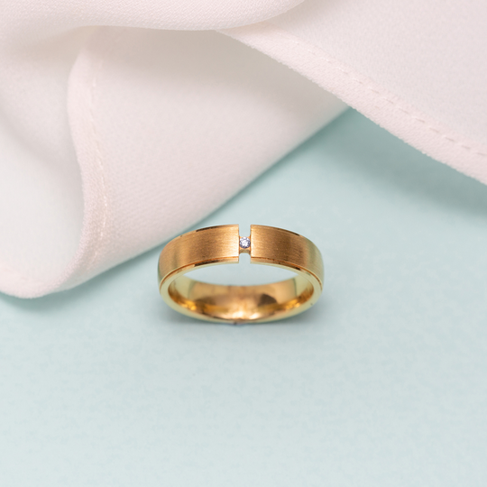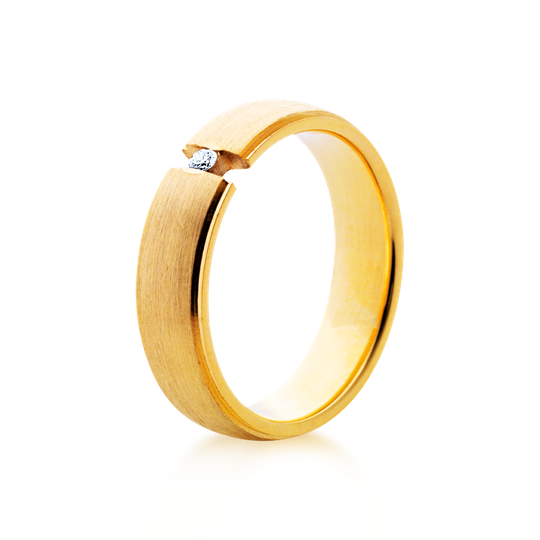 Aliança ouro de 19,2 quilates meia cana baixa com diamante. Tonalidade amarela, acetinada, pequeno rebordo polido. Interior amendoado para maior conforto. Possibilidade de gravação e personalização. As alianças First Day são produzidas em Portugal com o selo de qualidade do Lugar da Jóia.