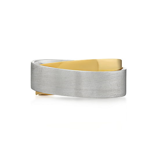 Aliança em ouro de 19,2 quilates bicolor de perfil plano e efeito de dupla aliança. Interior amendoado, para maior conforto. 7 mm de largura e acabamento mate e polido. Possibilidade de personalização.