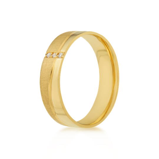 Aliança em ouro de 19,2 quilates com exterior plano e interior amendoado, com friso ondulado e três zircónias. 6 mm de largura e acabamento polido e mate. Possibilidade de personalização.