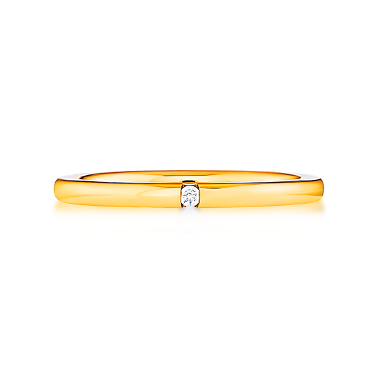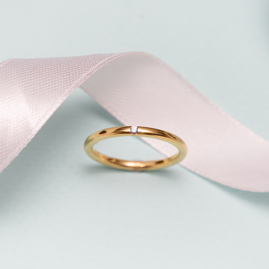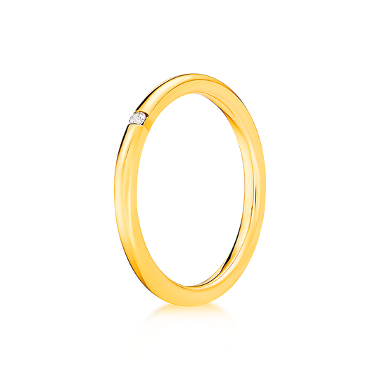 Aliança em ouro de 19,2 quilates com 2 mm de largura e meia cana alta com zircónia. Aliança polida com interior amendoado para maior conforto, com possibilidade de gravação e personalização. As alianças First Day são produzidas em Portugal com o selo de qualidade do Lugar da Jóia.