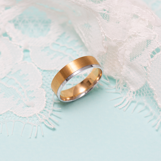 Aliança em ouro de 19,2 quilates lisa com 5 mm de largura. Tonalidade amarela mate com friso branco polido lateral. Aliança com interior liso, com possibilidade de personalização. As alianças First Day são produzidas em Portugal com o selo de qualidade do Lugar da Jóia.