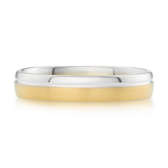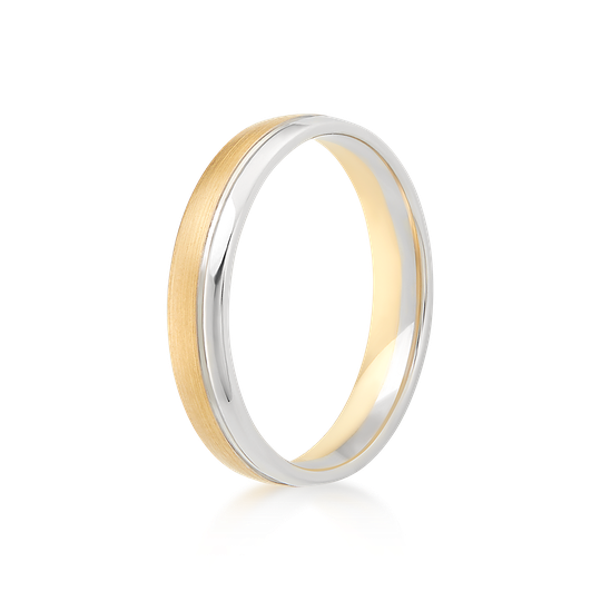 Aliança em ouro bicolor de 19,2 quilates meia cana baixa e interior amendoado, para maior conforto. Tonalidade amarela acetinada e branca polida. Possibilidade de personalização. Aliança de casamento de simplicidade robusta.