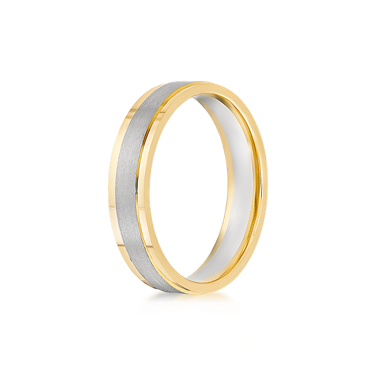 Aliança plana em ouro 19,2 quilates. Ouro branco acetinado e rebordos em amarelo polido. Interior amendoado, para maior conforto. Possibilidade de personalização.