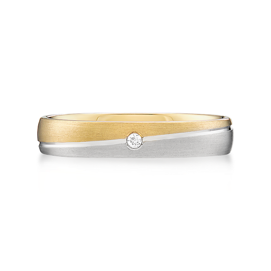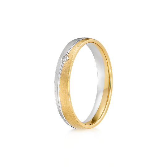 Aliança em ouro 19,2 quilates. Ouro branco acetinado e ouro amarelo acetinado entre um friso oblíquo e um pequeno diamante no centro. Interior amendoado, para maior conforto. Possibilidade de personalização.