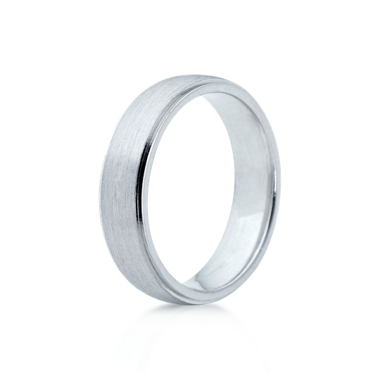 Aliança em ouro de 19,2 quilates meia cana baixa com 5 mm de largura. Tonalidade branca mate. Aliança com interior liso, com possibilidade de personalização. As alianças First Day são produzidas em Portugal com o selo de qualidade do Lugar da Jóia.