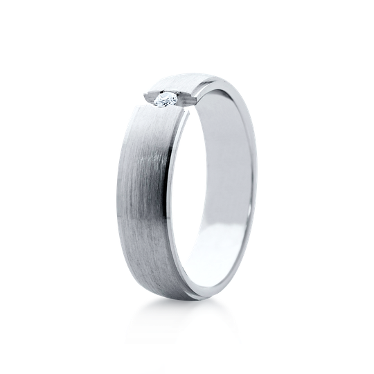 Aliança em ouro de 19,2 quilates meia cana baixa com 5 mm de largura unida por um diamante. Tonalidade branca mate. Aliança com interior liso, com possibilidade de personalização. As alianças First Day são produzidas em Portugal com o selo de qualidade do Lugar da Jóia.
