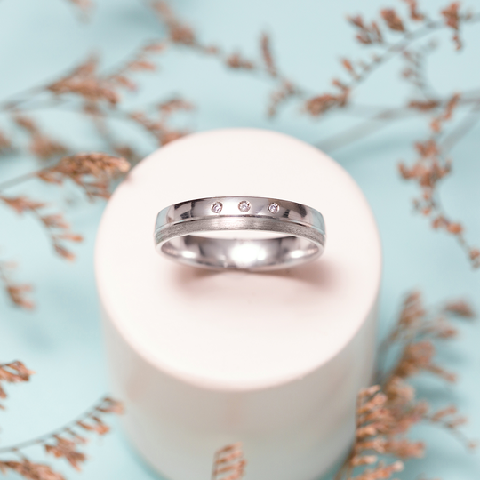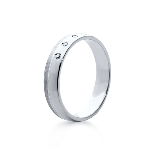 Aliança em ouro de 19,2 quilates meia cana baixa com 4 mm de largura. Tonalidade branca polida com três diamantes e um rebordo mate. Aliança com interior liso, com possibilidade de personalização. As alianças First Day são produzidas em Portugal com o selo de qualidade do Lugar da Jóia.