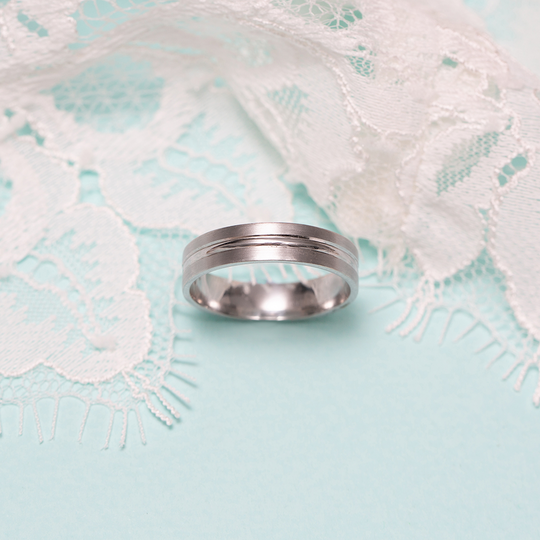 Aliança em ouro de 19,2 quilates lisa com 4.8 mm de largura. Tonalidade branca mate com friso polido ao meio. Aliança com interior liso, com possibilidade de personalização. As alianças First Day são produzidas em Portugal com o selo de qualidade do Lugar da Jóia.