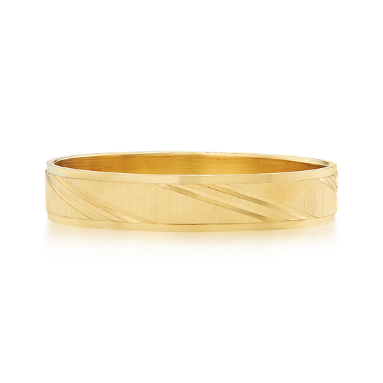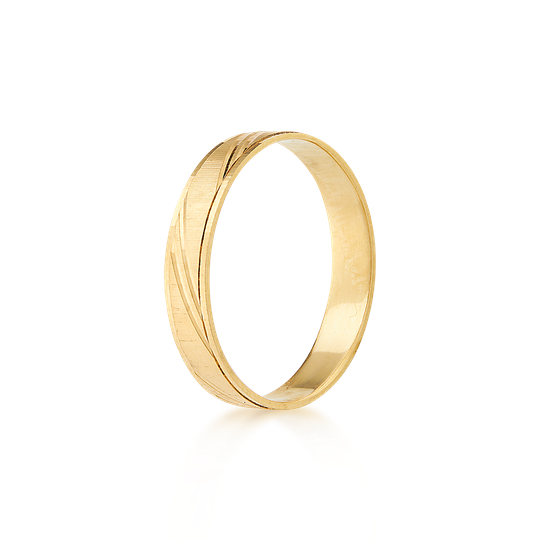 Aliança em ouro amarelo de 19,2 quilates com perfil liso. Acabamento polido riscado e pequenos frisos oblíquos. Possibilidade de personalização. Aliança de casamento subtil.