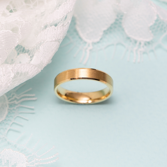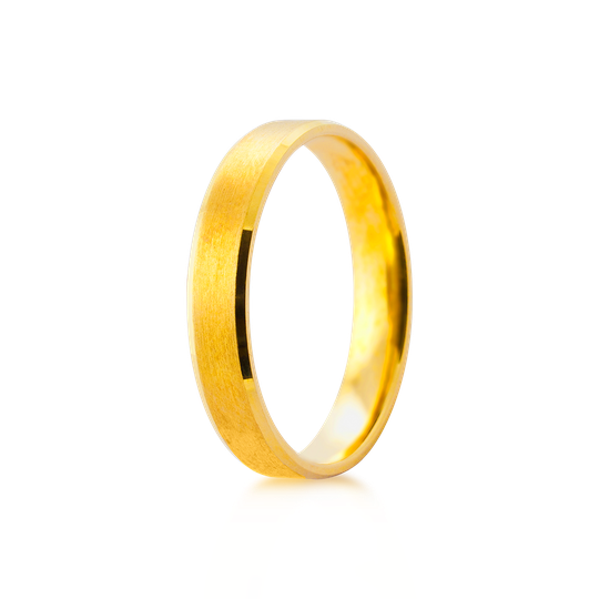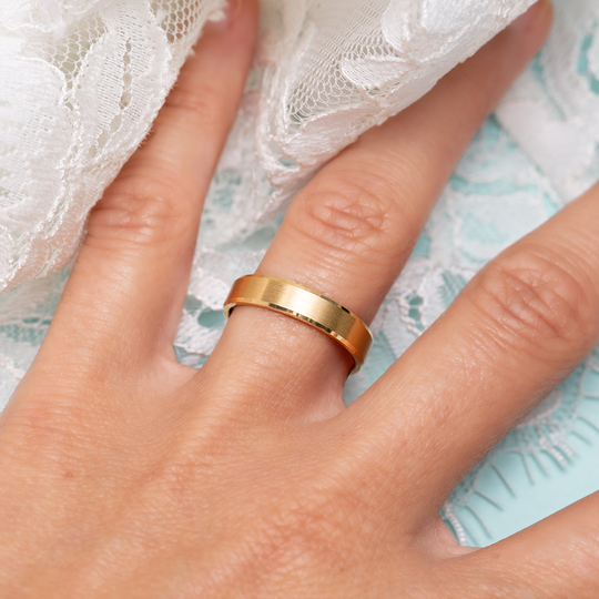Aliança em ouro de 19,2 quilates lisa com 4 mm de largura. Tonalidade amarela mate com finos rebordos polidos. Aliança com interior liso, com possibilidade de personalização. As alianças First Day são produzidas em Portugal com o selo de qualidade do Lugar da Jóia.