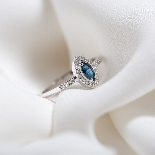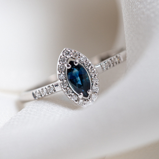 Anel estilo solitário em ouro branco com uma safira oval envolvida em diamantes. Uma jóia de design elegante e intemporal, que perpetua a magia e emoção do noivado.