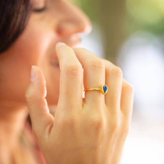 Anel em prata dourada com zircónia azul marinho em forma de gota. Anel ajustável para maior conforto e versatilidade. Calor a Cores é uma coleção de jóias de tons dourados e cores brilhantes.