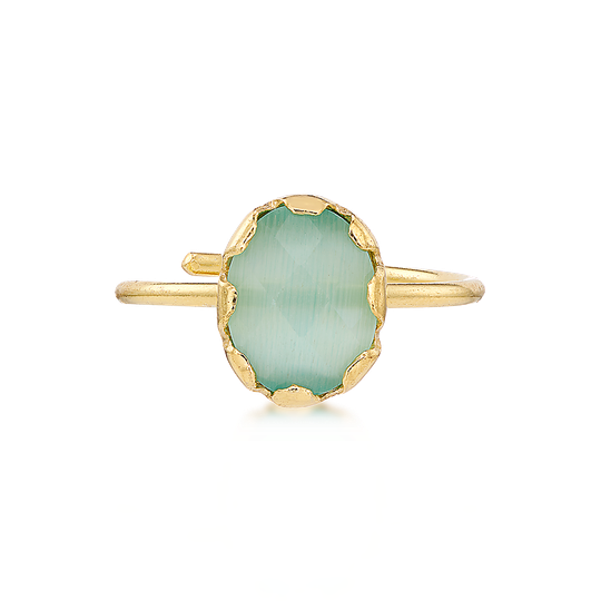 Anel em prata dourada com gema sintética verde água. Ajustável ao dedo. Uma jóia com presença elegante.