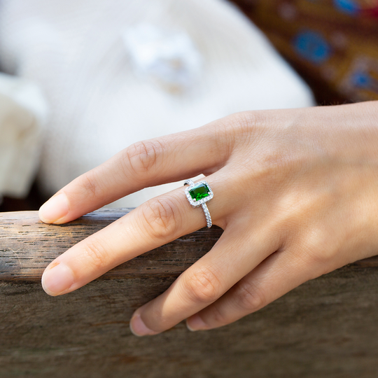 Anel em prata com gema sintética retangular verde envolta em pequenas zircónias incolores. Um clássico para dias importantes ou um anel que brilha numa festa.