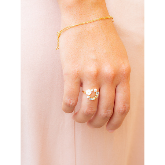 Anel em prata dourada em forma de grinalda com zircónias incolores e flor branca. Anel ajustável. As jóias Grinalda integram a coleção À Flor da Pele.