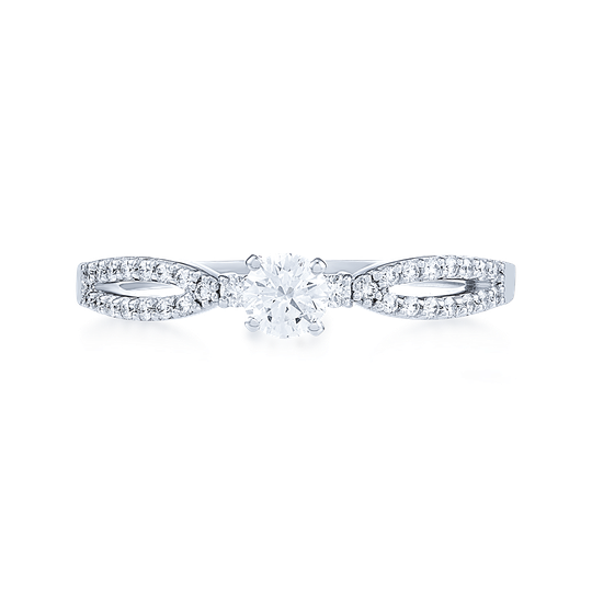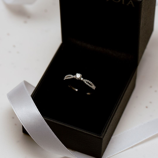 Anel em ouro branco de 19,2 quilates com um diamante no centro e 32 diamantes criando um delicado efeito de laço. Uma escolha surpreendente para o noivado.