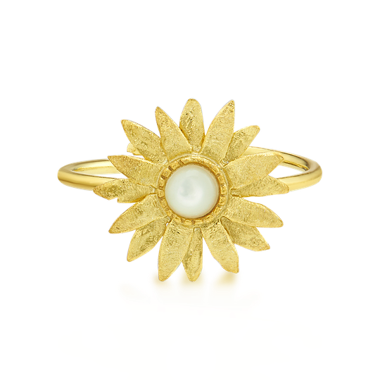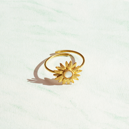 Anel em prata dourada com flor de pétalas finas com madrepérola no centro. Anel ajustável.