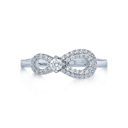 Anel em prata com zircónias formando um laço assimétrico. Um clássico para dias importantes ou um anel que brilha numa festa.
