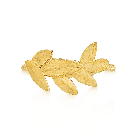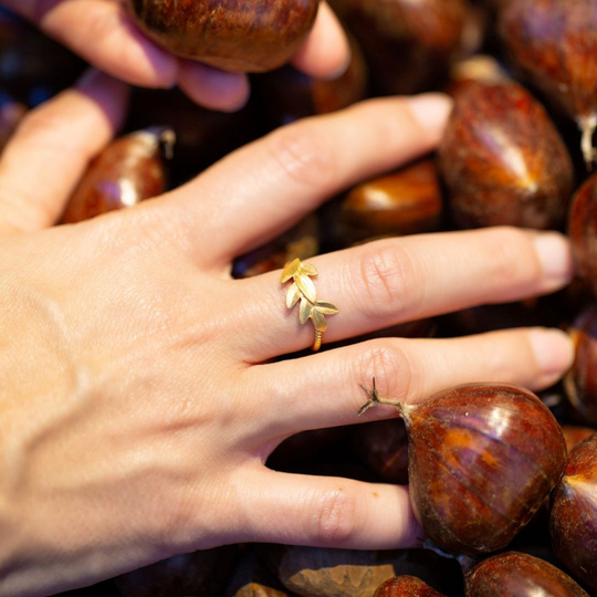 Anel ajustável em prata dourada com sete folhas mate. A delicadeza de uma jóia que surpreende.