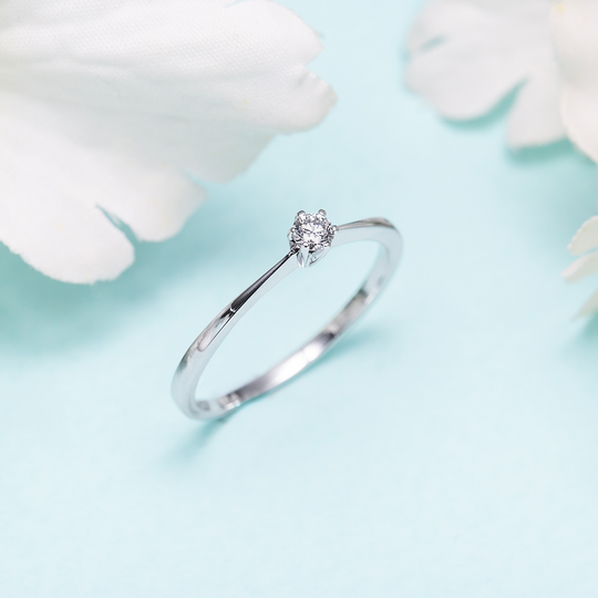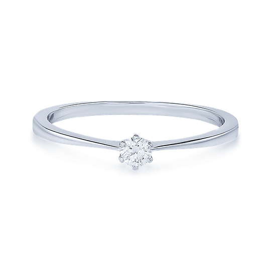 Anel solitário em ouro branco com diamante no centro. Uma jóia de design elegante e intemporal, que perpetua a magia e emoção do noivado.
