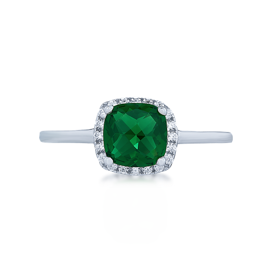 Anel em prata com zircónia verde quandragular rodeada de pequenas zircónias incolores. Anel elegante, perfeito para festas.