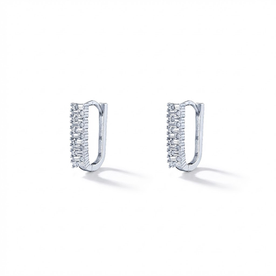 Argolas modernas com perfil geométrico, realçadas por duas fileiras de zircónias em corte baguete. O design estruturado traz um toque contemporâneo à elegância clássica da prata.