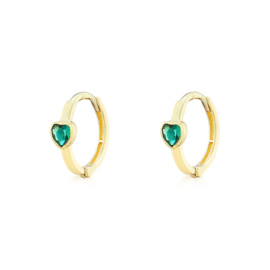 Argolas em ouro de 9 quilates com pequena zircónia verde em forma de coração na frente. Confortáveis, apertam com fecho de clique.