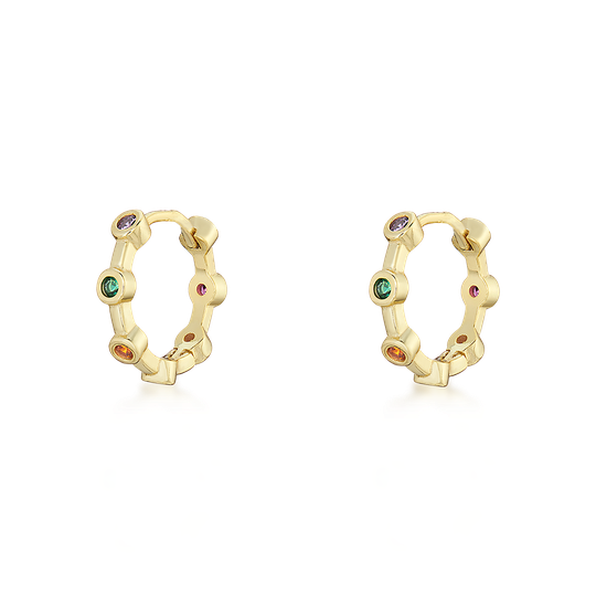 Argolas em prata dourada com pequenas zircónias redondas coloridas. Brincos com fecho de clique.