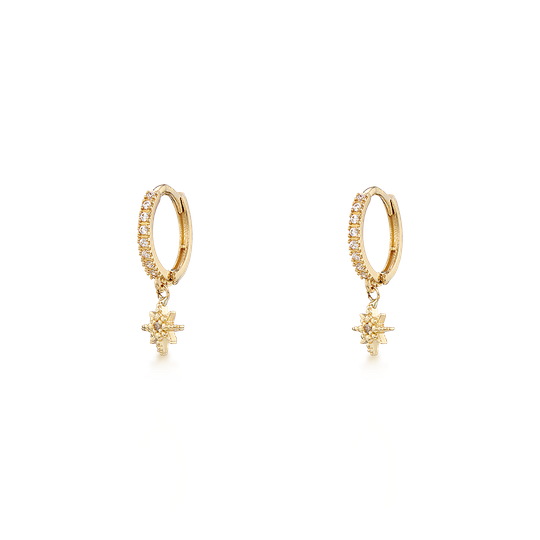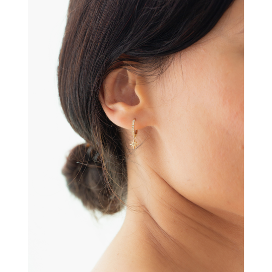 Argolas em ouro de 9 quilates com pequenas zircónias e pendente em forma de estrela com zircónia. Apertam com fecho de clique. Confortáveis e fáceis de colocar, perfeitas para usar só ou combinar com outros brincos.