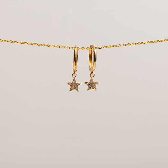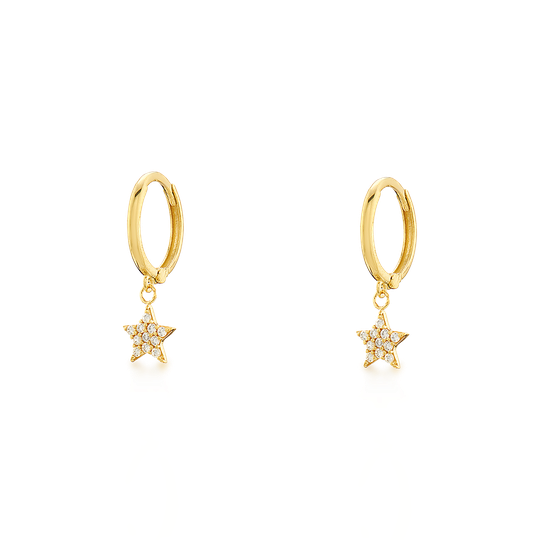 Argolas em ouro de nove quilates com pendentes estrela com zircónias incolores. Brincos com fecho de clique.