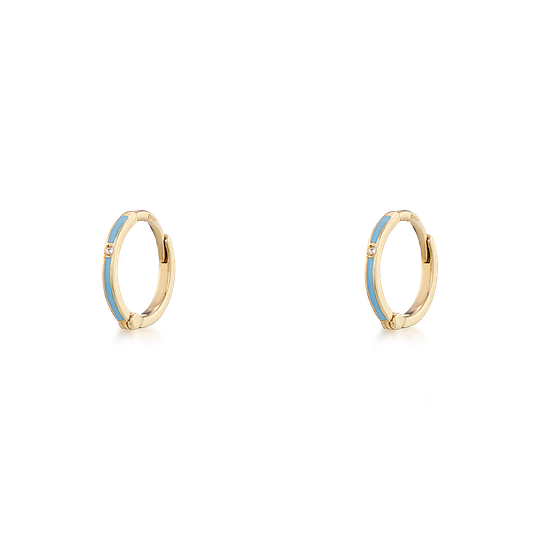 Argolas finas redondas em ouro de 9 quilates com esmalte azul turquesa e pequena zircónia. Apertam com fecho de clique. Confortáveis e fáceis de colocar, perfeitas para usar só ou combinar com outros brincos.