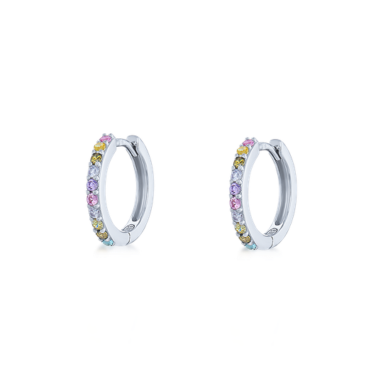 Argolas em prata com zircónias coloridas. Brincos confortáveis com fecho de clique.