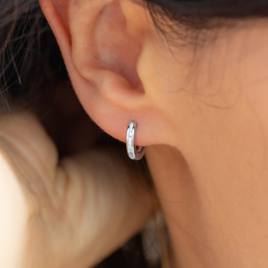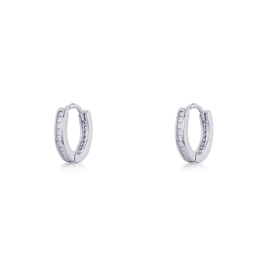 Argolas redondas em prata com fecho de clique e fila de pequenas zircónias. Confortáveis e fáceis de colocar, perfeitas para usar só ou combinar com outros brincos.