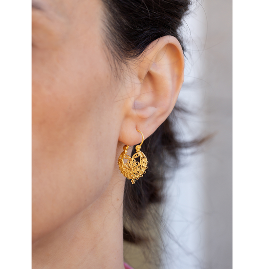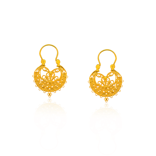 Brincos Arrecadas de filigrana em prata dourada. De referência histórica na joalharia tradicional portuguesa, a filigrana eleva o carisma da destreza manual.
