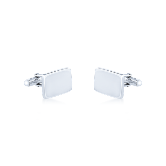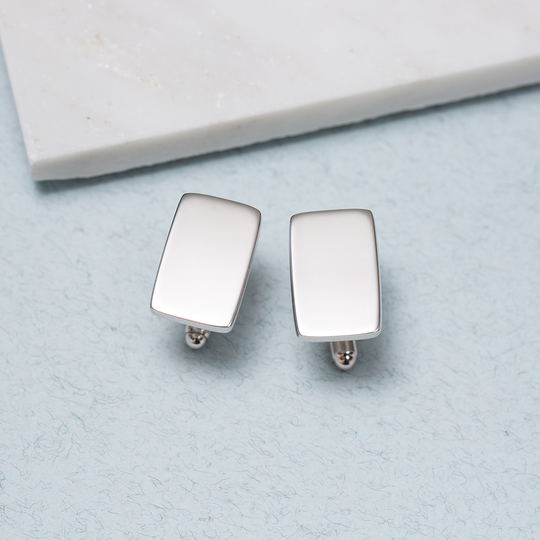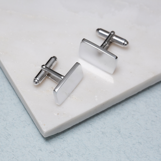 Botões de punho retangulares em prata 925 polida. Uma jóia imprescindível em datas especiais, como casamentos e outras celebrações. Fáceis de colocar e de fabrico português. Podem ser personalizados com um ou dois caracteres, como iniciais, por exemplo.
