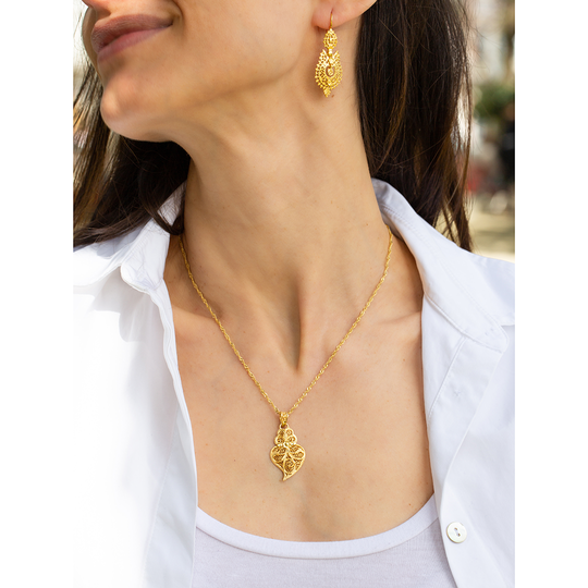 Brincos de filigrana em prata dourada com fecho de gancho. Os brincos à rainha são um modelo icónico da tradição portuguesa. Também conhecidos como brincos de fidalga, foram popularizados na região do alto Minho.