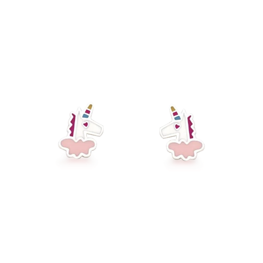Brincos em prata em forma de unicórnio numa nuvem rosa. Brincos pequenos com fecho de espeque.