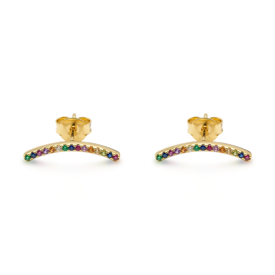 Brincos em prata dourada com delicado arco de zircónias coloridas. Um modelo moderno e luminoso que acrescenta um toque de cor e elegância ao look.