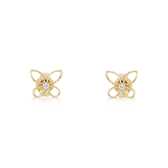 Brincos em ouro de 9 quilates em forma de borboleta discreta com pequena zircónia no centro. Brincos pequenos com fecho de espeque.