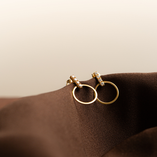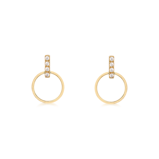 Brincos em ouro de 9 quilates com quatro pequenas zircónias segurando um círculo. Brincos com fecho de espeque.