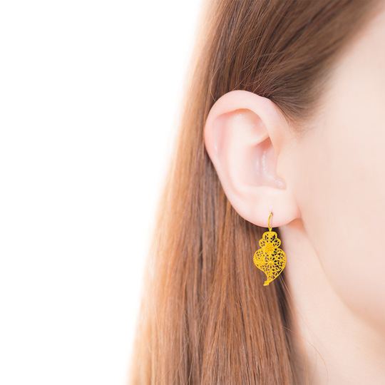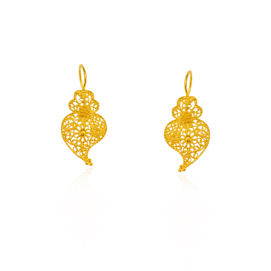 Brincos de filigrana em prata dourada com forma de coração de Viana. De referência histórica na joalharia tradicional portuguesa, a filigrana eleva o carisma da destreza manual. O coração de Viana é uma dos maiores símbolos da portugalidade.