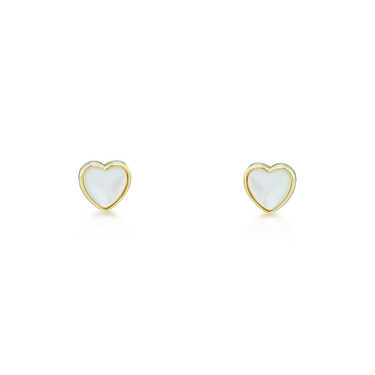 Brincos em prata dourada e madrepórola em forma de coração. Brincos pequenos com fecho de espeque.