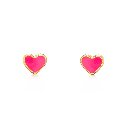 Brincos em ouro de 9 quilates em forma de coração rosa choque. Brincos pequenos com fecho de espeque.