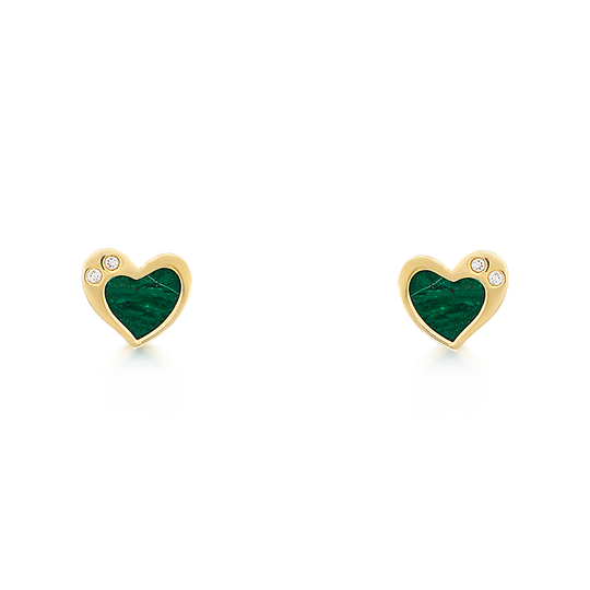 Brincos em ouro de 9 quilates têm formato de coração com detalhe em pedra verde malaquite e duas zircónias incolores, criando um contraste moderno e luminoso. Perfeitos para usar no dia a dia ou oferecer como símbolo de afeto.