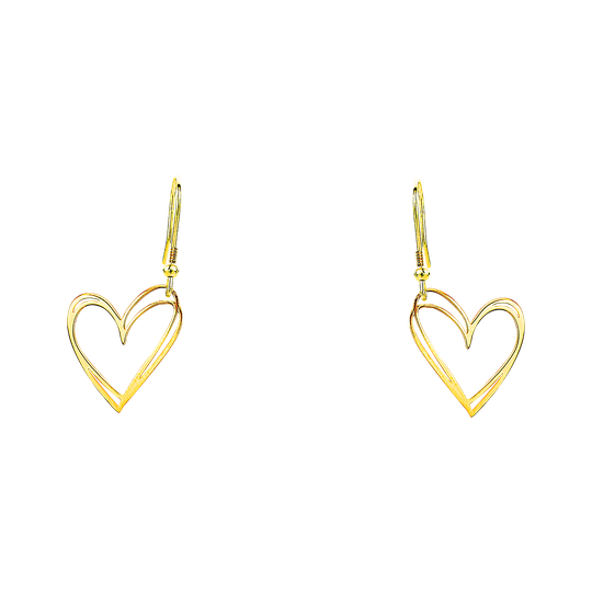 Brincos em prata dourada com dois elegantes corações recortados. Brincos médios de gancho, sem fecho
