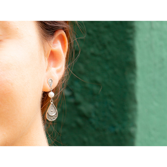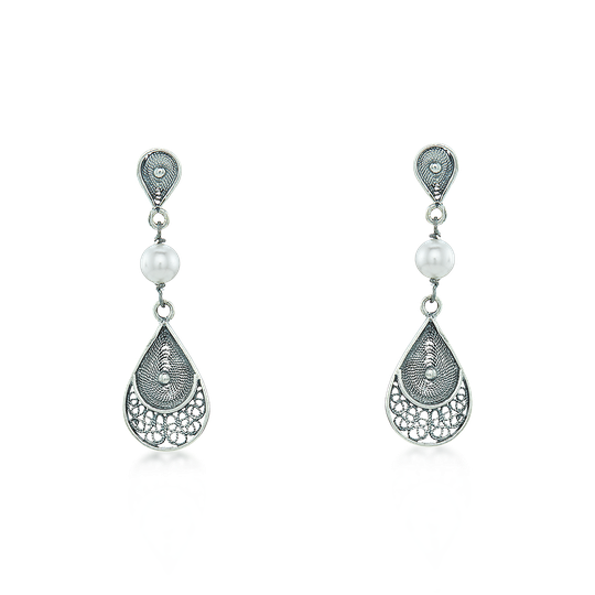 Brincos de filigrana em prata om pérola. Brincos esguios com fecho de espeque.
