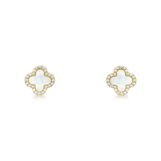 Brincos em prata dourada com madrepérola e zircónias. Brincos pequenos com fecho de espeque.